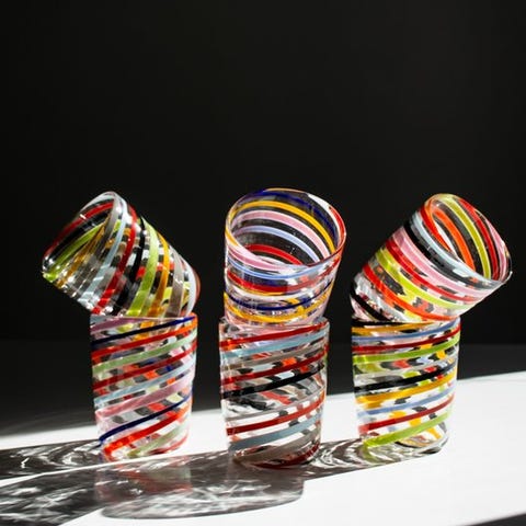 Elegant, raffineret, holdbart ... Smukke Murano-glasbordglas i krystal med pletter fra det prestigefyldte Effetre Murano. Designet af Mar'yana Iskra, en ung designer med en kunstgrad fra Skt. Petersborg og en passion for Murano-glas, hvor hun samarbejder med mange mestre. Disse glas er frugten af Mar'yanas kærlighed til Murano-glas og maleri. Når Mar'yana designer glas, er der kun lidt tid