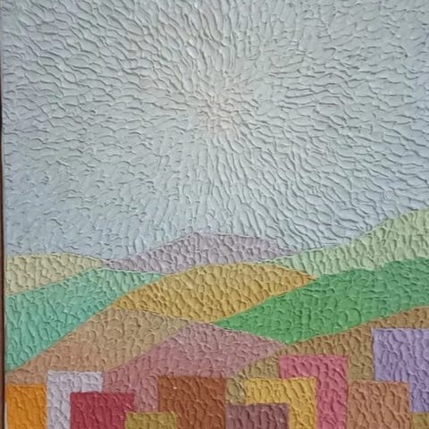 Forestillende udsigten over et bjerglandskab, en scene fra hverdagslivet på landet, inspireret af macchiaiolistisk naturalisme, med en materiel penselstrøg præget af markant syntese og komposition. Maleriet er indrammet i en elegant ramme beskyttet af glas.