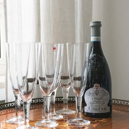 Fabelagtigt sæt bestående af 6 originale champagne- og hvidvinsglas fra Carlo Moretti. Glasset er rent venetiansk krystal i krystal, som kun Carlo Moretti kunne producere. Bunden er solid glas og meget stabil. Dekoreret af venetianske glarmestre i guld.