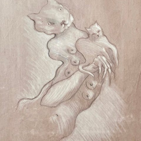 Dette papirværk med titlen "Silent Metamorphosis" tilhører en afgørende periode i Robert Detheux' arbejde, hvor kunstneren udforsker kroppens transformation og grænsen mellem menneske og dyr. Værket, der blev skabt i 2005, vidner om hans interesse for hybride former, der svinger mellem sensualitet og