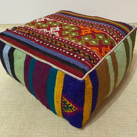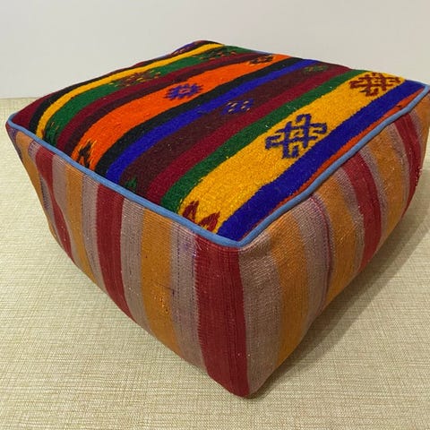 Vores puffer er et vidunderligt dekorativt produkt, som du nemt kan bruge i alle hjørner af dit hjem og din have. Størrelsen på puden er ca. 48 (bredde) x 48 (længde) x 25 (højde). Vores puffer er lavet af 100% ren uld fra gamle tæpper. Da de originale anatolske tæpper bruger naturlige farvestoffer og materialer, er hvert stykke unikt. Der kan ses forskelle i farver, naturlig slitage, asymmetriske mønstre og linjer – dette er naturen af gamle tæpper, hvilket gør dem unikke kun for dig. Vores puffer er håndlavede med den højeste kvalitet af syning, så du kan nyde dem i mange år. Det er op til dig at fylde den, du kan fylde den med skumstykke, formet skum,