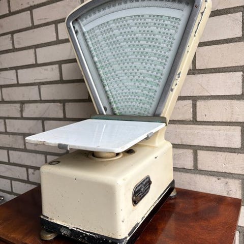 Smukt eksemplar af en professionel mekanisk vægt "Italiana", produceret af den historiske virksomhed Macchi Francesco di Santo Stefano (Varese). Et ægte stykke historie inden for italiensk industriel design, karakteriseret ved en elegant linje og en robust metalstruktur med en tidløs charme.