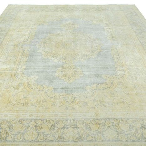Stor håndknyttet designerteppe fra Pakistan i moderne vintage-look. Det diskrete cirkel- og strukturmønster i bløde beige- og blånuancer virker elegant og tidløst.