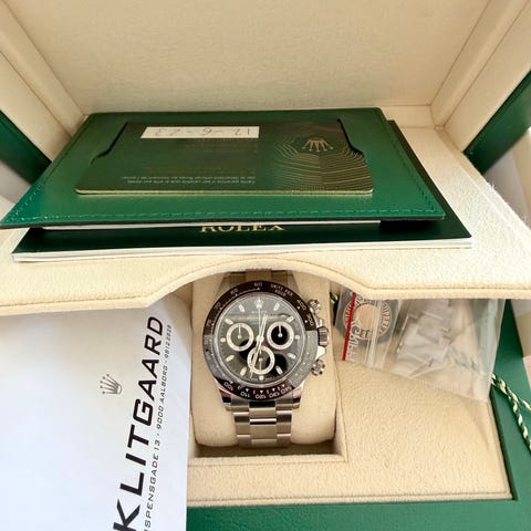 Rolex Daytona reference 116520, automatisk stålur 40 mm fra 2010, sort skive, ny med fabriksgaranti og beskyttelsespuder, fuldt sæt med original æske, papirer og garanti. Klik på den blå "gå til varen" knap, for at købe eller byde på denne vare. Den samlede pris vil blive vist inden du afgiver dit bud.