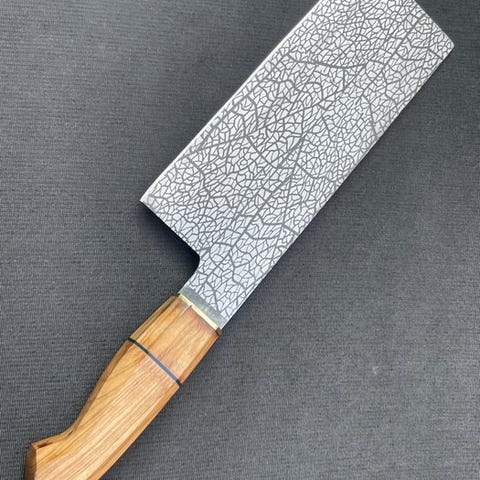 Knivens håndtag er et kunstværk—et smukt færdigt trægreb, der giver et ergonomisk, behageligt greb i timevis af madlavning. Den naturlige træstruktur giver en sikker, skridsikker overflade, samtidig med at den tilføjer et strejf af elegance til ethvert køkken. Perfekt balanceret, er kniven…