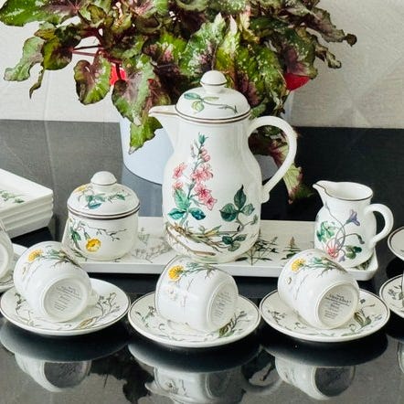 Et fint kaffestel til to fra den kendte keramikefabrikant Villeroy & Boch. To kopper samt mælkekande og sukkerskål på en lille tallerken. Som ekstra en lille flødekanne med dens tallerken. Hele sættet er forsynet med reliefdekorationen Cortina og Cortina 2000. Cortina 2000-eksemplarerne har den samme dekor, men er lidt nyere. Størrelsen er på sukkerkanden.