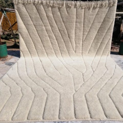 Oprindelse Marokko, Moderne marokkansk Mrirt tæppe – Cream Wool Texture Design, 100% uld, 1 stk, 200 x 300 cm, vægt 15 kg, High Atlas-regionen, 21. århundrede, i meget god stand og professionelt rengjort. Klik på den blå "gå til varen" knap, for at købe eller byde på denne vare. Den samlede pris vil blive vist inden du afgiver dit bud.