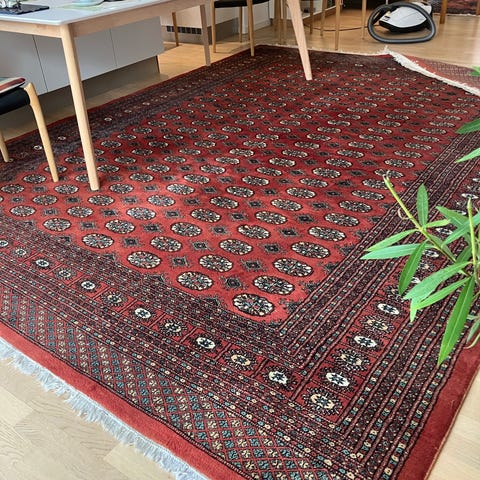 Antikt Bokhara-russisk-turkoman Tekke tæppe, vævet omkring årene 1920–1940 i forrige århundrede, typisk ikonografi af elefants fod (gul), klassisk i farverne, i god generel stand, god pilehøjde, viser kun få små brud som følge af tiden og som nemt kan restaureres, som på billedet. Ca. 290×183 cm