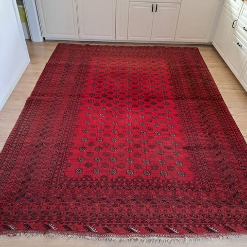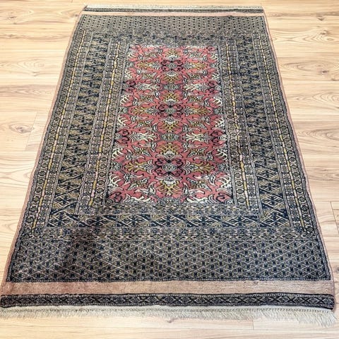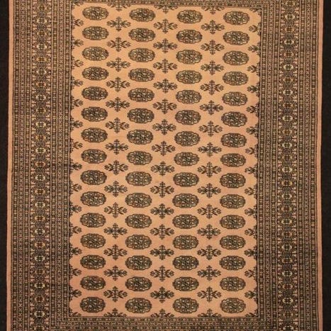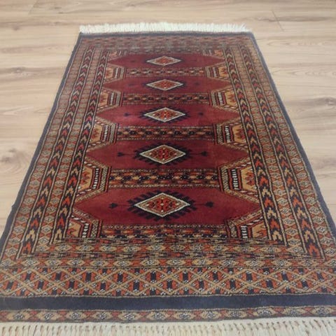 Hånd-knyttet orientalsk tæppe fra Pakistan (Punjab/Lahore), slutningen af det 20. århundrede, Bukhara-inspireret mønster med ottagonale gul i feltet på en rød-bordeaux baggrund, uldpile, bomuld i under- og overgarn, mål 187 × 116 cm, i god stand, professionelt rengjort. Klik på den blå "gå til varen" knap, for at købe eller byde på denne vare. Den samlede pris vil blive vist inden du afgiver dit bud.