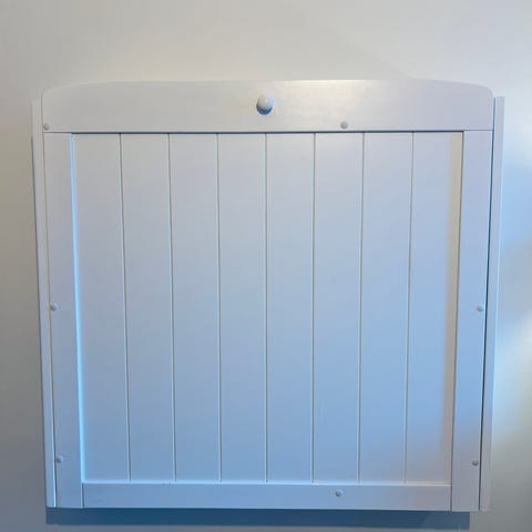 Puslebord væghængt i hvid. Puslebordet kan klappes op mod væggen for at spare plads og har indbyggede hylder til opbevaring af bleer, tøj og plejeprodukter. Egnet til brug på børneværelse eller badeværelse, hvor der er behov for en funktionel pusleplads med opbevaringsmuligheder.
