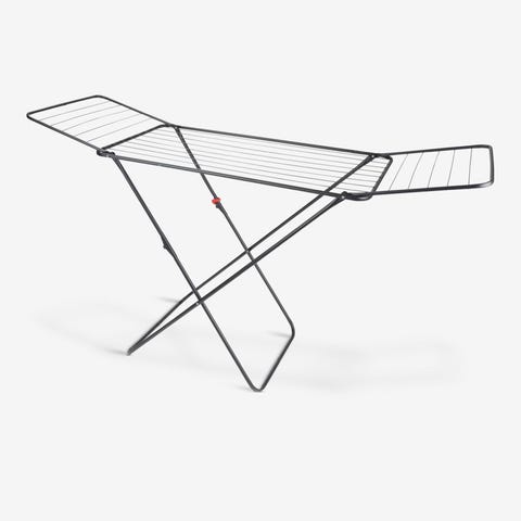 IKEA tørrestativ i hvidmalet metal. Sammenklappeligt stativ med flere tørresnore til ophængning af tøj indendørs. Velegnet til brug i mindre rum som køkken, badeværelse eller bryggers, hvor der er behov for en enkel løsning til tøjtørring. Let konstruktion, der er nem at flytte og opbevare, når det ikke er i brug.