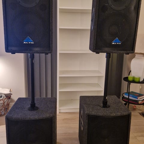 Der er med kvalitets enheder fra Beyma, de er rigtig velspillende, samlet pris for alle 6 højtalere er 4500,- men kan også opdeles i 2 sæt med 2 topkasser og 1 bundkasse, et sådant sæt koster 2500,-