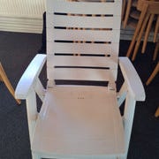 Stolen har en enkel, klassisk design med en stribet ryg og armstøtter. Den er lavet af plastik, hvilket gør den let og holdbar. Possionsstol