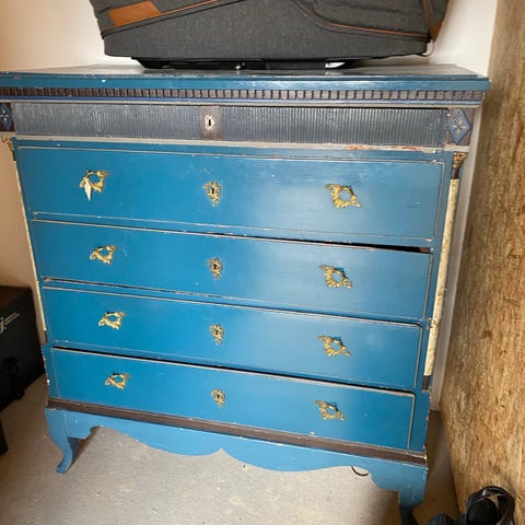 Kommoden har 4 rummelige skuffer og en flot patina med masser af personlighed. Almindelige brugsspor efter alder.