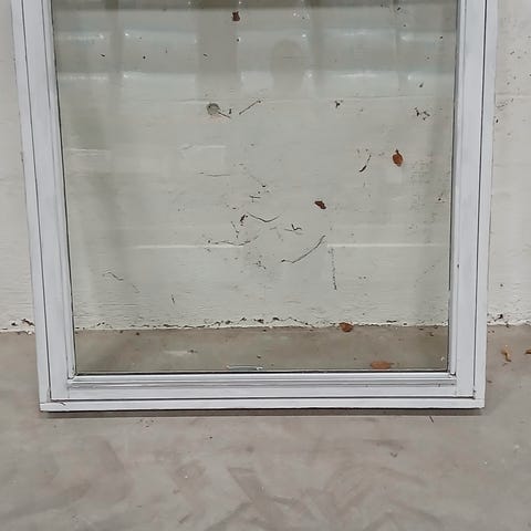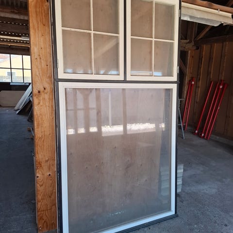 Kvadratisk trævindue med termorude. Vinduesrammen er ubehandlet og beslag i metal. Har fire stk nye med klart rude, samt 1 brugt med meleret glas.