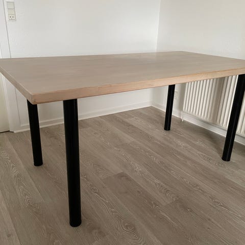 Spisebord i lyst træ med rektangulær bordplade og fire lige ben. Bordet har et enkelt, minimalistisk design, der passer ind i mange typer indretning. Velegnet som spisebord i køkken eller spisestue, men kan også bruges som arbejdsbord eller hobbybord. Overfladen fremstår i lyst træ med synlig åretegning.