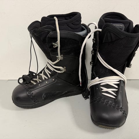 Snowboardstøvler i sort/hvid. Støvlerne har snørelukning og kraftig gummisål med mønster for bedre greb. Inderstøvlen er polstret for øget komfort og støtte.