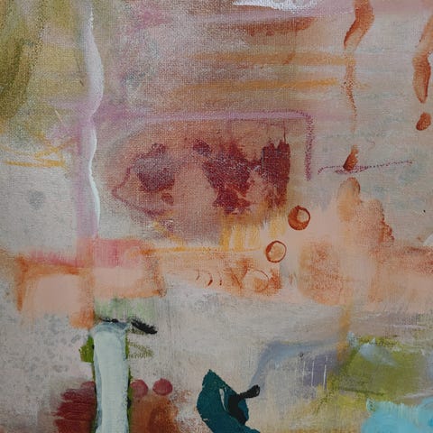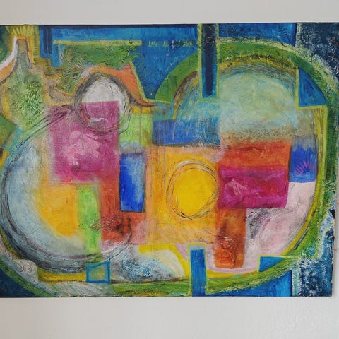Abstrakt maleri i blå nuancer med detaljer i orange, grøn og hvid. Motivet består af organiske og geometriske former i lag, der skaber dybde og struktur i billedfladen. Maleriet er udført på lærred og egner sig til ophængning i stue, kontor eller andre opholdsrum. Kunstner og præcis størrelse er ikke oplyst.