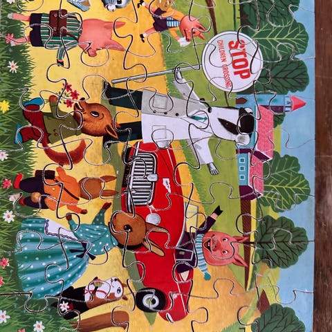 Retro fra 70erne. Træpuslespil med motiv af havn og skibstrafik. Brikkenes motiver omfatter blandt andet skib, lastbil, tog, kraner og små både. Puslespillet er udført i træ med farverigt tryk og små greb på brikkerne, så de er nemme at tage op og sætte på plads. Velegnet som aktivitetslegetøj til børn, der øver finmotorik og genkendelse af motiver fra havnemiljø.