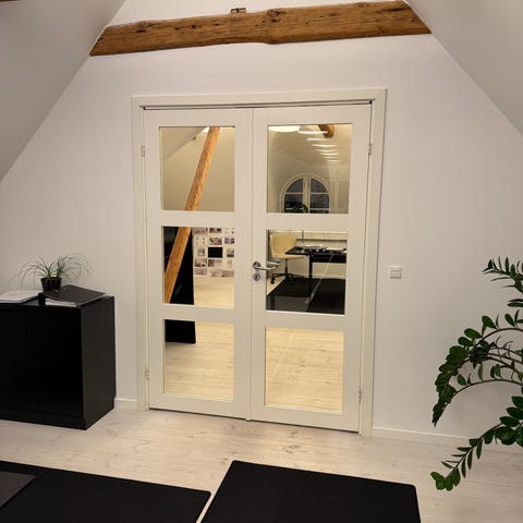 Dobbeltdør med glasfelter i hvid. Døren består af to dørfløje med flere ruder i hver fløj, hvilket giver et klassisk sprosset udtryk og god lysgennemgang mellem to rum. Velegnet som indvendig dør mellem eksempelvis stue, køkken eller udestue, hvor der ønskes både adskillelse og lysindfald. Inkl karm
