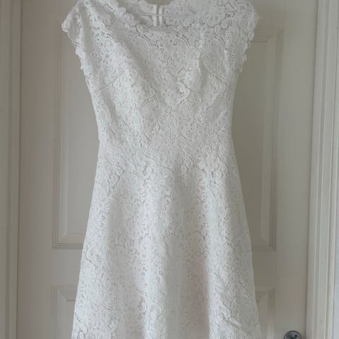 Hvid konfirmationskjole med lange ærmer. Har blonder fra livet og op. str 38.