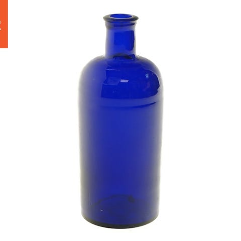 Flasken er 32 cm høj og har en klar blå farve. Den kommer med en lukkeprop, der er sikret med en metalholder. Flasken har en glat overflade og en rund bund. Den er velegnet til opbevaring af væsker eller som dekoration.