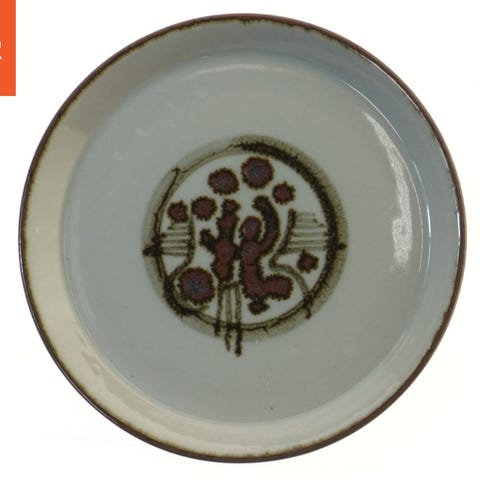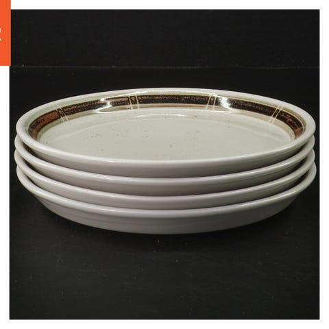 Sættet inkluderer fire porcelænstallerkener med en diameter på 23 cm. Tallerkenerne har en glat hvid overflade med en dekorativ kant i brune nuancer. Bagsiden af tallerkenen viser et mærke der kunne indikere producenten.