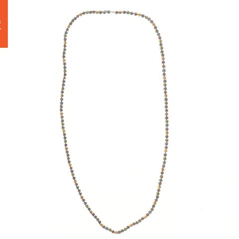 Billedet viser en lang perlekæde, der måler 152 cm. Den er lavet af små, ensartede perler og har en enkel lukning. Kæden kan bæres som enkelt eller dobbelt lag som vist i billederne.