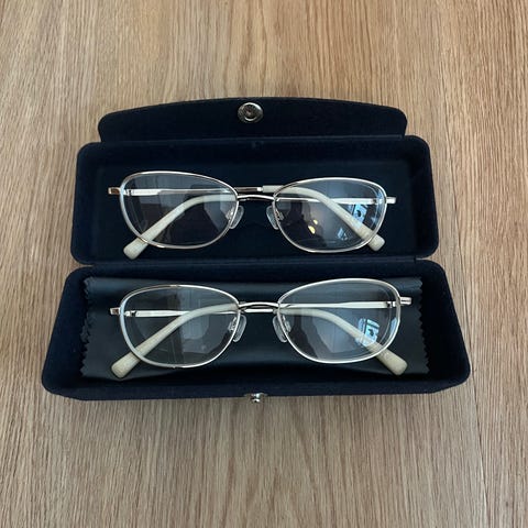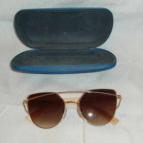 Solbrillerne har en rektangulær form med tynde, guldfarvet stel og brunt glas. Brillerne kommer med et blåt etui, som har 'Louis Nielsen' mærket på toppen.