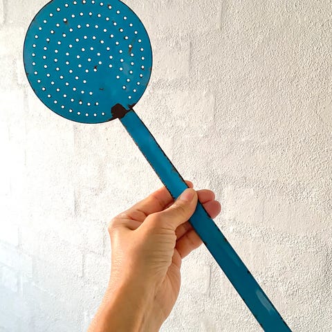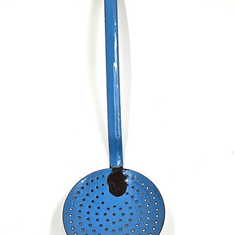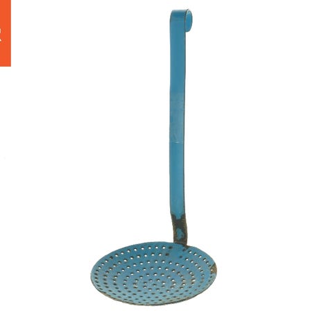 Lang metalske med huller, ideel til skoldning eller dræning af mad. Den har et blåt håndtag og en flad, rund hoved med jævnt fordelte huller. Størrelsen er 38,5 cm. Skeens overflade har tegn på brug, især omkring håndtaget.