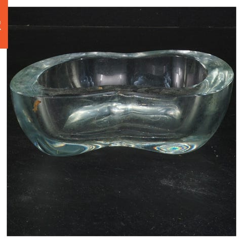 En stor, dekorativ skål formet som et blad. Skålen er fremstillet af gennemsigtigt materiale med en diameter på 38 cm. Designet inkluderer fine detaljer, der ligner årene på et blad.