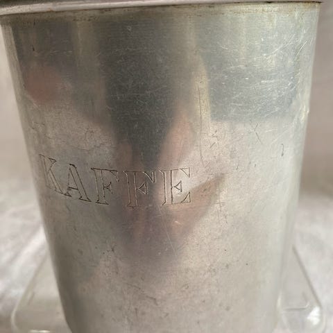 Keramisk kaffedåse med en diameter på 12 cm og en højde på 13 cm. Den har et hvidt porcelænsdesign med dekorative blade og bær samt ordet 'kaffe' påtrykt. Låget er lavet af træ og passer tæt til dåsen. Nederst på dåsen er der et mærkat, der viser, at den er fremstillet i Tyskland.