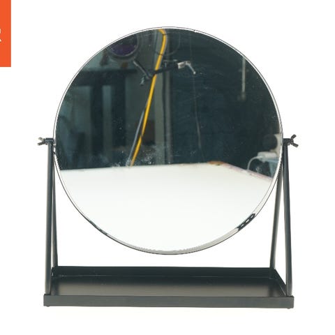 Et bordstående spejl med en justerbar ramme, som kan roteres. Spejlets mål er 37x27 cm. Rammen er lavet af sort metal, og det har en praktisk base til støtte. Spejlet kan anvendes på et skrivebord eller en makeupstation.
