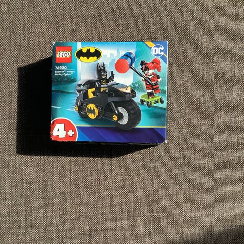 Sættet 'LEGO 76220 Batman versus Harley Quinn' indeholder LEGO minifigurer af Batman og Harley Quinn samt en motorcykel og tilbehør som en hammer og en skateboard. Designet er i Batman-tema med ikoniske detaljer og farver primært i sort og gul. Sættet er egnet til børn fra 4 år og op og inkluderer byggevejledning.