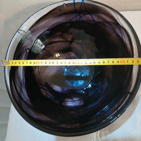 Skål med fod i blå , hvid og grønne farver fra Kosta Boda.