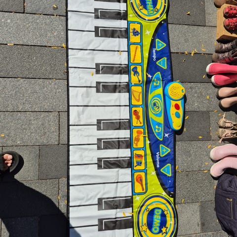 Dette er et legetøjs keyboard med mikrofon, lavet af plast. Den har farvekodede tangenter og forskellige lydknapper. Der er en fastgjort mikrofon på en holder og det hele står på små ben. Det ser ud til, at det er designet til børneunderholdning og musikalsk leg.