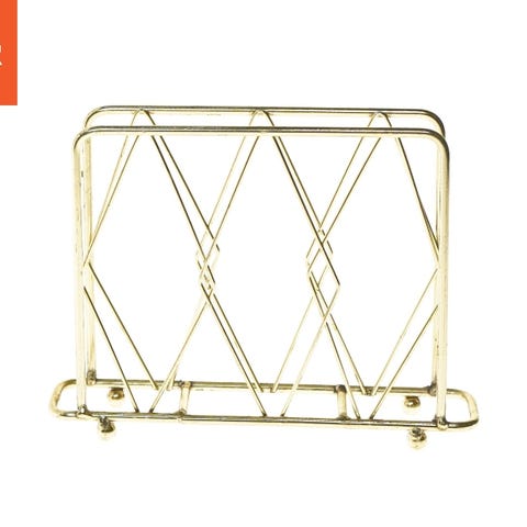 Magasinholder i metal med guldfarvet finish. Den har et geometrisk design med krydsende linjer og en robust bund til opbevaring af magasiner eller dokumenter. Størrelsen er 30,5x37,5 cm.