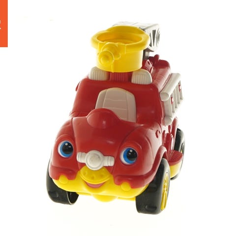 Dette legetøj er en brandbil formet som et legetøjskøretøj med en størrelse på 12x4x16 cm. Den har en rød krop med bærende blå hjul og et orange lys på toppen. Der er en tegning af en brandmand i vinduet. På bagsiden er der et rum, som kan åbnes med en skrue. Der findes også nogle mærker og CE-certificeringer.
