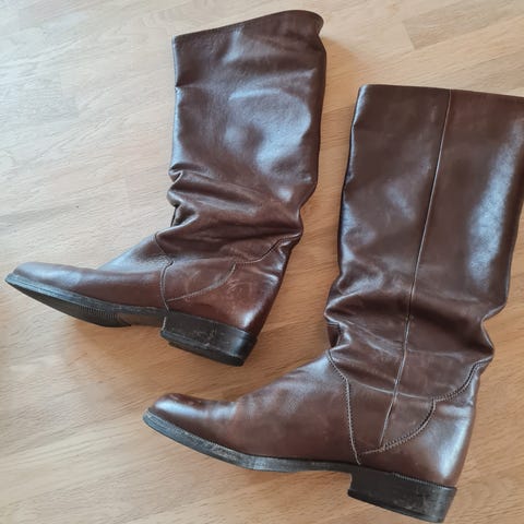 Et par brune læderstøvler til kvinder. Støvlerne har en inderr lynlås med en lille rem detalje på toppen, en blokhæl, og sort sål og hælkappe. Der er synlige slidmærker på tå og hæl områderne.