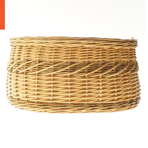 Kurven er flettet og har en oval form med to håndtag. Håndtagene er lavet af porcelæn og er hvide. Denne kurv kan bruges til opbevaring eller som en dekorativ genstand. Målene er 10x28x45 cm.