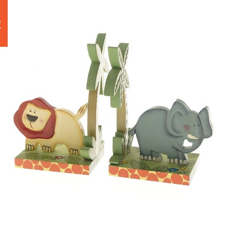 Disse bogstøtter har et design med ko-motiver og er lavet af træ, malet i lyseblå og hvid. Hver bogstøtte har en kofigur malet med sorte pletter og små farvede detaljer som gule bjælder og blå sko. De er beregnet til at holde bøger oprejst på en hylde eller bord. Størrelsen er 12x9x13 cm.