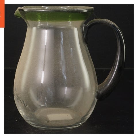 En glas kande, 17 cm høj, med indgraveret blomstermotiv. Kanden har en sort hank og en klar, glat krop. Designet giver et elegant udtryk, ideel til servering af drikkevarer.