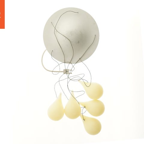 Billedet viser en pendellampe med dråbeformede elementer, der hænger fra en rund base. Lampens diameter er 33 cm. Ledningerne er tynde og giver et moderne udtryk. Lampen har en hvid rund base og lysel gul dråbeformede dele, hvilket giver et elegant udseende.