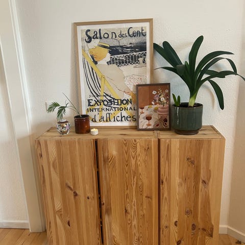 Ivar skab fra IKEA. Malet i Jotun Daydream supermat - en smuk bordeaux/jord farve. Med greb og egetræs ben. Benene er 15cm - dvs skabet bliver 98cm højt i alt (med mindre de skrues af).