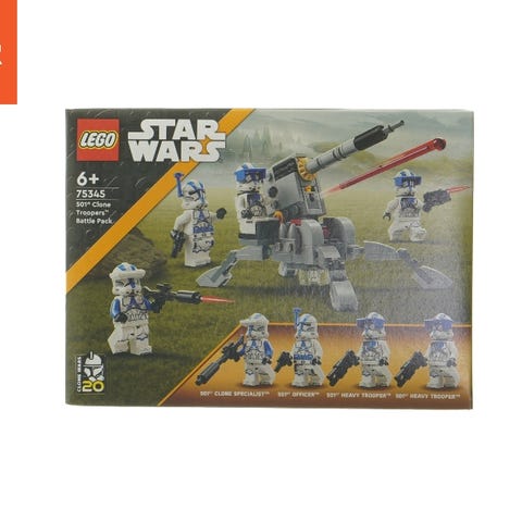 LEGO Star Wars sæt, modelnummer 75345, kendt som 501st Clone Troopers Battle Pack. Boksen indeholder klonetrooper-figurer og en kanon, og er mærket som egnet til børn fra 6 år og op. Boksen er 14x4,5x19 cm. Der er advarsler om små dele på siden af boksen. LEGO logoet og Star Wars branding er synligt på forsiden.