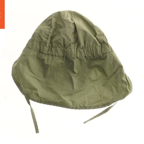 Solhat i hvid stof med bred skygge og nakke beskyttelse. Den har justerbare stropper for en sikker pasform. Perfekt til udendørs aktiviteter for at beskytte mod solen.