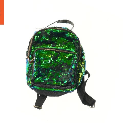 Rygsæk med et farverigt mønster på forsiden, der inkluderer forskellige symboler og figurer. Tasken har grønne stropper og en grøn lynlås. Den primære farve på resten af tasken er mørkeblå. Størrelsen er 38x34 cm, og der er en lomme på fronten med en lynlås til opbevaring.