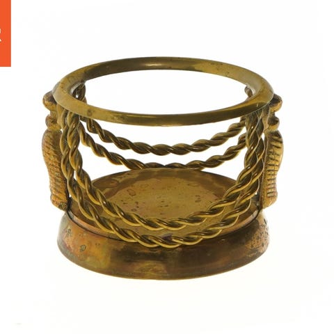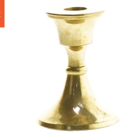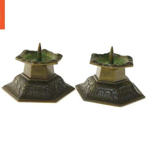 En dekorativ lysestage i messing med fire arme, hver udsmykket med en facet-slebet glaskugle. Lysestagen er monteret på en rund fod og har en patineret overflade.