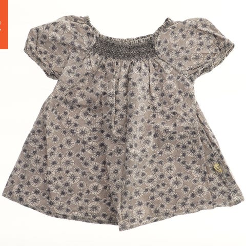 En kortærmet tunika med et blomstret mønster. Den har en elastisk halsudskæring med rynker og er lavet i et let materiale.