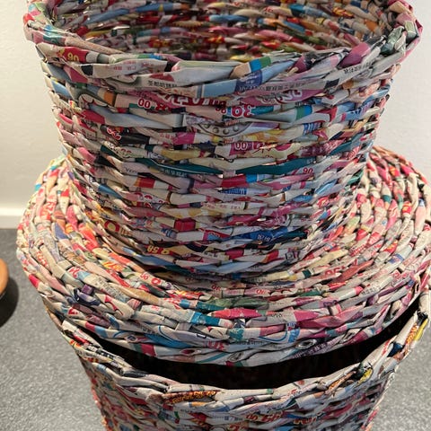 Flettet kurv af avispapir (str. 29x22x23 cm)